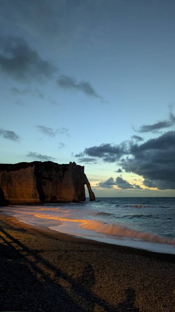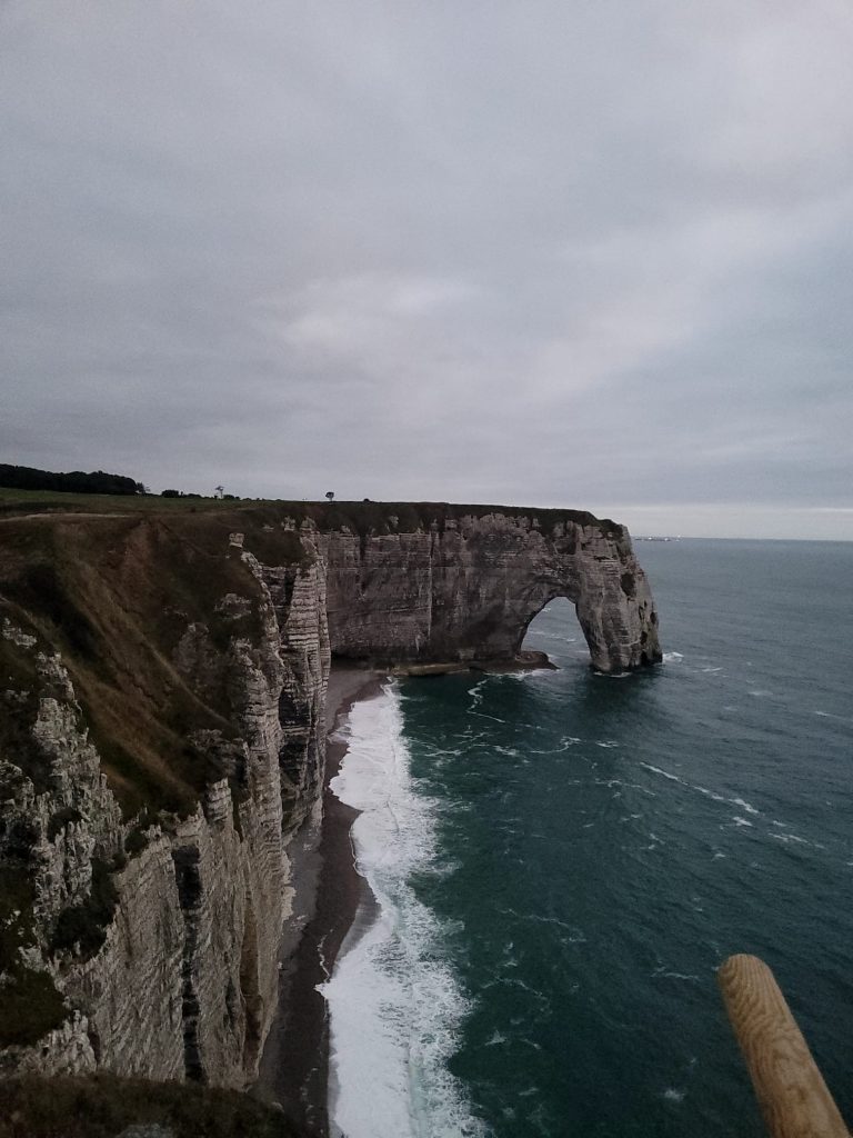 Późnym popołudniem morska, owocowa uczta i ruszyliśmy na zachód słońca do Etretat i tutaj… ponieśliśmy porażkę… Pogoda okazała się kapryśna i słońce nie wyszło z za chmur żeby zajść… Korzystając z przypływu nagraliśmy jednak mocne fale u stóp klifów. Zrobiliśmy też kilka awaryjnych ujęć na szczycie najsłynniejszego klifu o nazwie Aval.